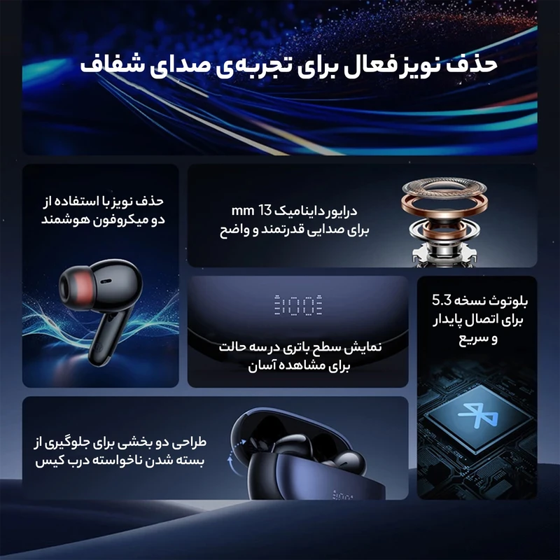 | سایر مشخصات | دارای نمایشگر دیجیتال جهت نمایش درصد شارژ باتری کیس و همچنین میزان باتری گوش چپ و راست -دو بار لمس گوشی چپ : فعال شدن دستیار صوتی Siri / جواب دادن به تماس / قطع کردن تماس -نگه داشتن دست روی گوشی چپ : رفتن به آهنگ قبلی -دو بار لمس گوشی راست : فعال و غیرفعال کردن ANC / قطع و وصل کردن تماس -نگه داشتن دست روی گوشی راست : رفتن به آهنگ بعدی / رد تماس -راحتی فوق العاده به هنگام فعاليت هاي روزانه مانند پیادهروی، دویدن، دوچرخهسواری، رانندگی -دارای ۲ میکروفون داخلی Mic AI Noise Cancellation -طراحی درب کیس پله ای بسیار هوشمندانه جهت باز کردن راحت کیس -طراحی سه بعدی آرگونومیک بسیار جذاب متناسب با گوش افراد ، بدون احساس درد در گوش يا خارج شدن هندزفري از گوش به هنگام فعاليت هاي روزانه -دارای گواهینامه سلامت و ایمنی CE/ RoHs/ FCC |